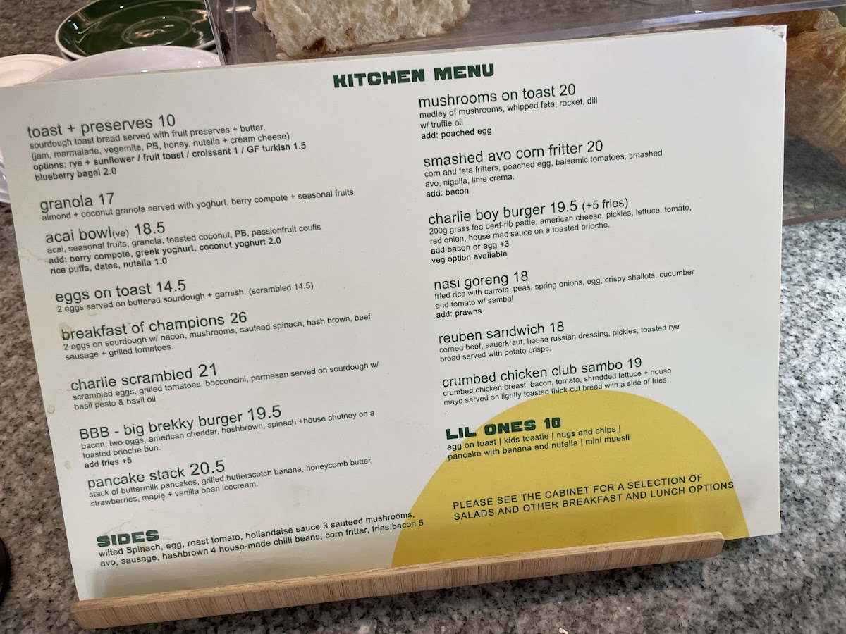 - Sides: Additional items can be added to meals, including extra eggs, wilted baby spinach, bacon, sautéed mushrooms, and house-made chili beans.